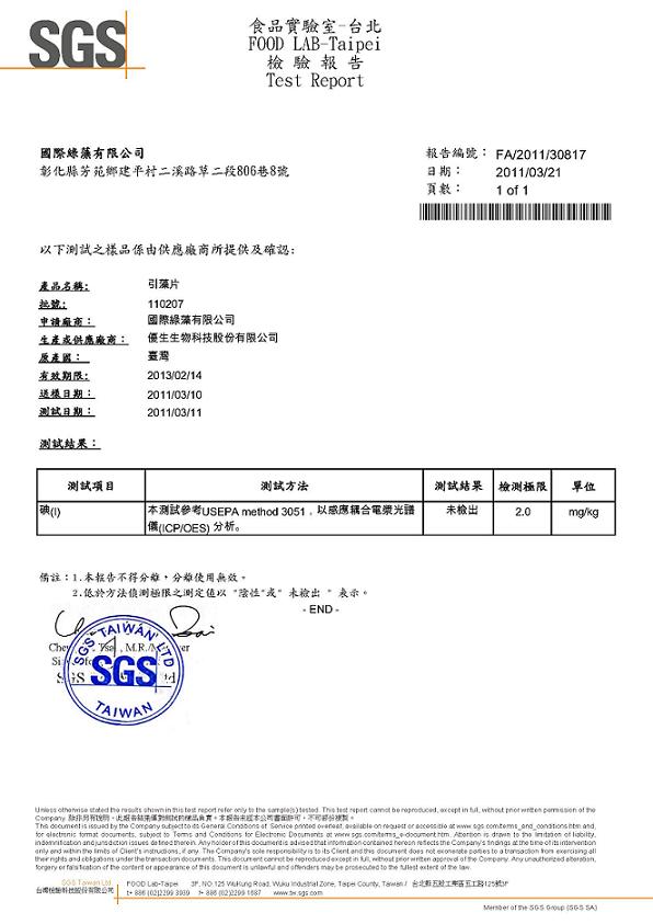 引藻 碘含量未檢出(檢測極限值2ppm)