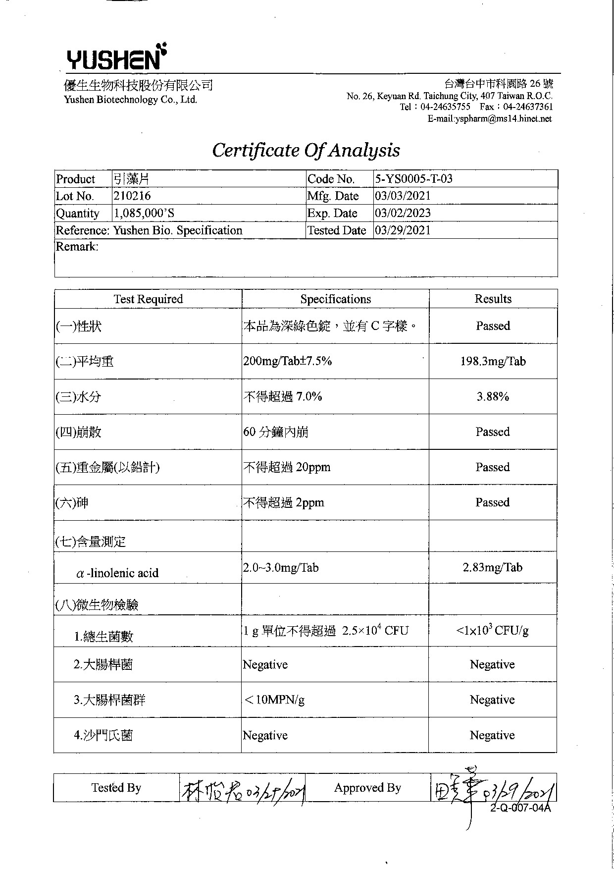 健康食品三認證引藻片檢驗報告(LOT.:210216)